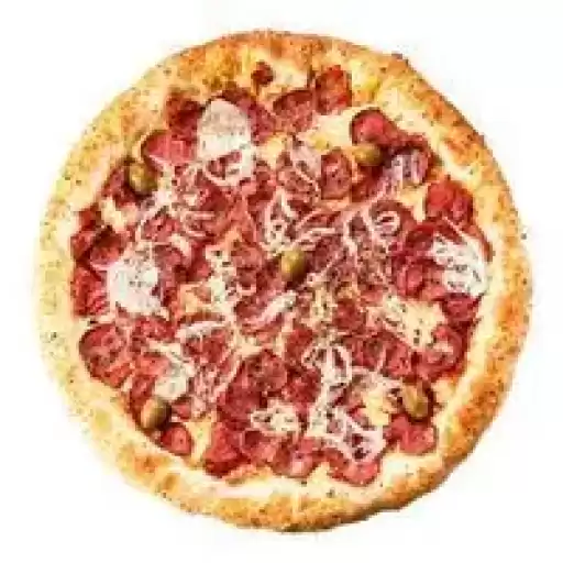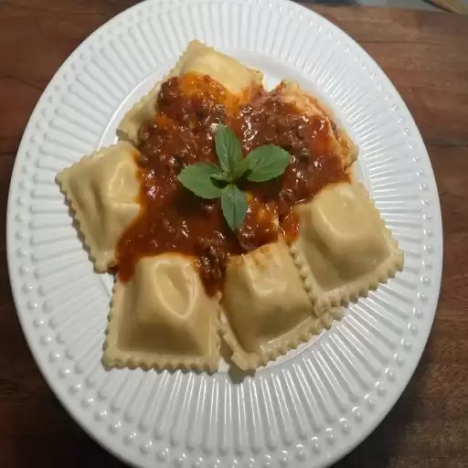Raviole recheado com alcatra desfiado, molho de tomate caseiro e queijo ralado.