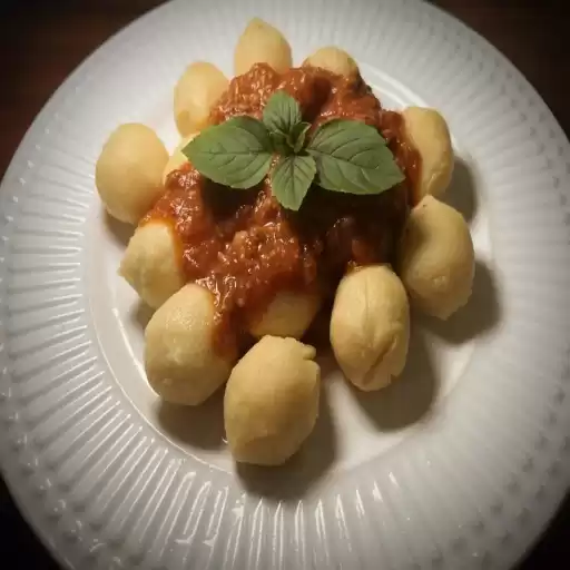Nhoque de batata recheado com queijo, molho bolonhesa e queijo ralado.