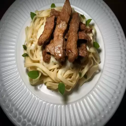 Macarrão caseiro talharim ao molho de gorgonzola, acompanhado de tiras de filé mignon