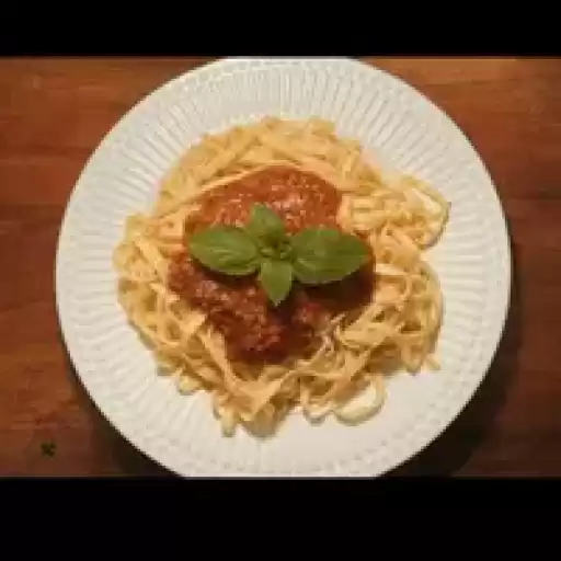 Talaharim caseiro, molho bolonhesa e queijo ralado.